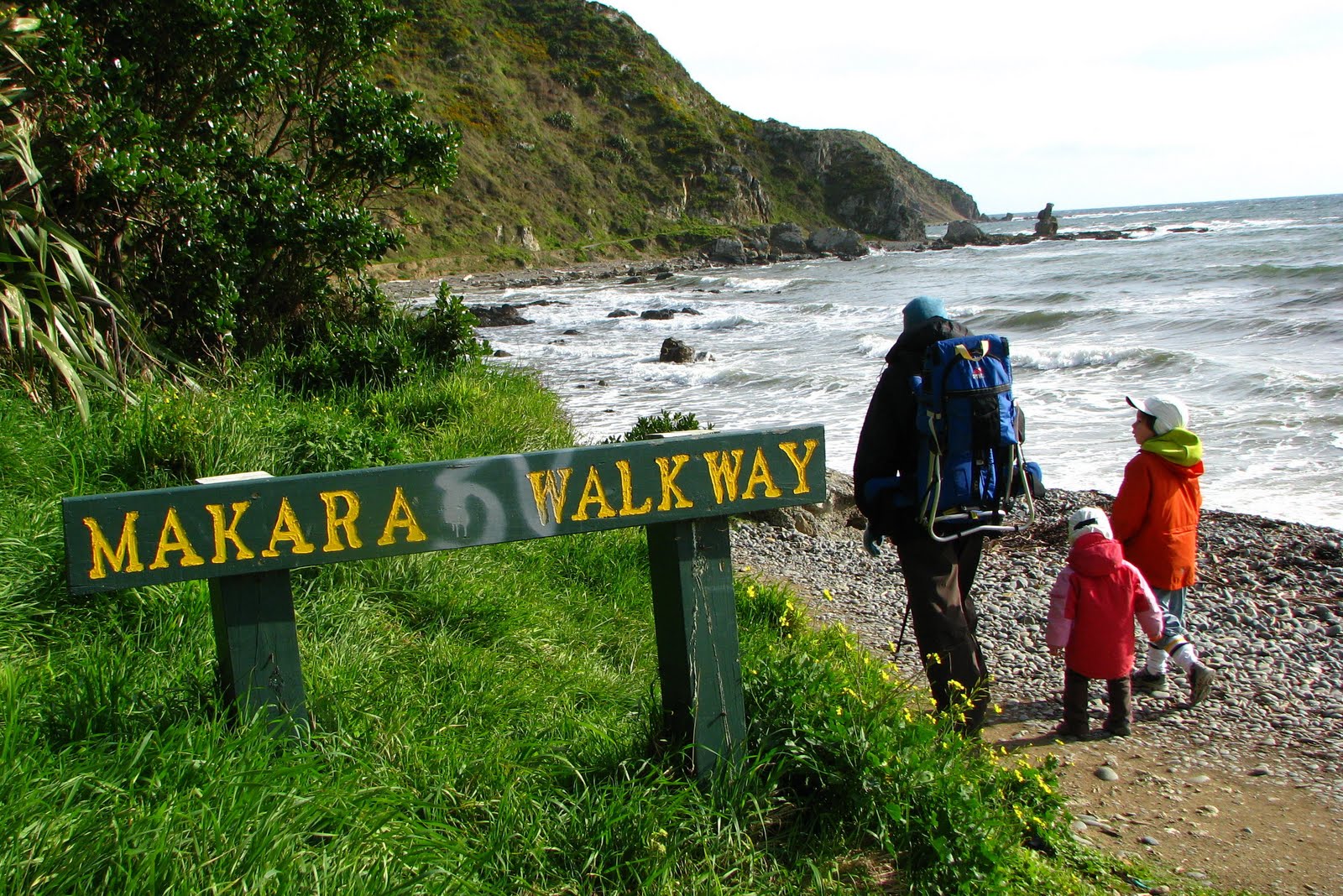Today was our last opportunity to hike the Makara Walkway before it closes until October for the lambing season. On the way, we stopped at The Original German Bakery at Kelburn Shops to round out our picnic lunch with a rosemary foccacia. Past the Wellington suburb of Karori, city abruptly gives way to sheep country: brush and pasture. On Makara Road, we threaded steep hills and valleys to Makara Beach at Ohariu Bay.